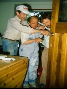 “They had a ramp so they could walk up this little floor to build the walls, and John, he’d walk up this little narrow ramp and cross the gap between the ground and the floor no problem. He’d be in there checking on what Ron and Nathan were doing and if they were keeping up the work,” Dick remembers.